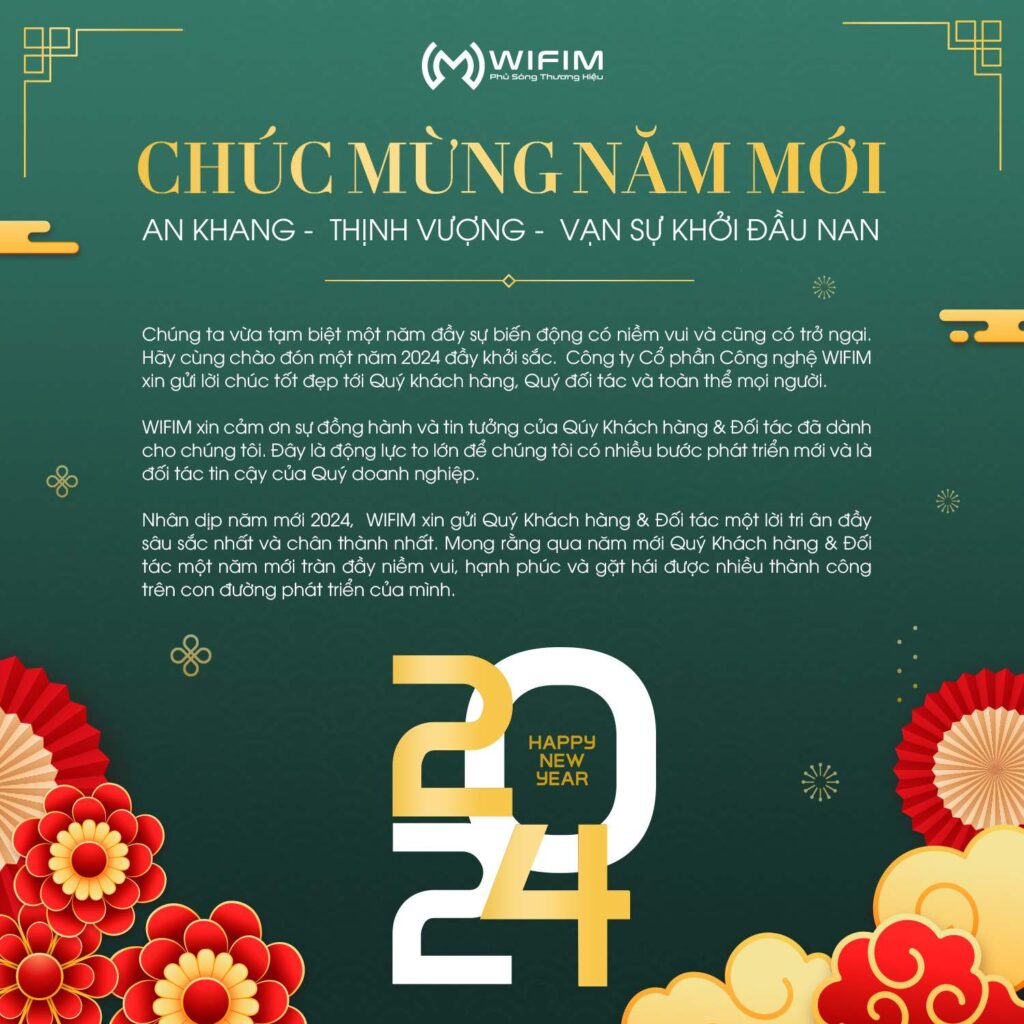 Chúng ta vừa tạm biệt một năm đầy sự biến động có niềm vui và cũng có trở ngại. Hãy cùng chào đón một năm 2024 đầy khởi sắc. Công ty Cổ phần Công nghệ WIFIM xin gửi lời chúc tốt đẹp tới Quý khách hàng, Quý đối tác và toàn thể mọi người.