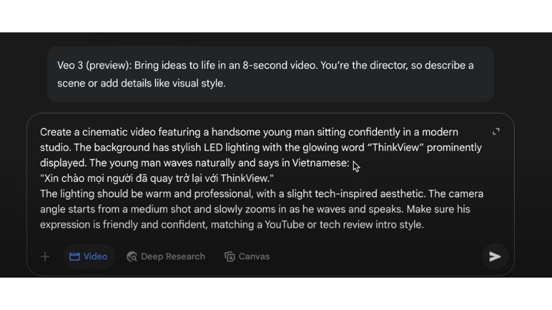- Bước 3: Nhập văn bản mô tả bằng tiếng Anh. Nhấn nút gửi → Veo 3 tự động tạo video.