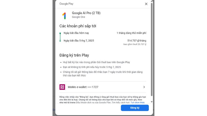 - Hoàn tất thanh toán 0 đồng để kích hoạt gói dùng thử. Sau khi nhập thông tin, Google sẽ xử lý và xác nhận gói dùng thử miễn phí cho bạn.