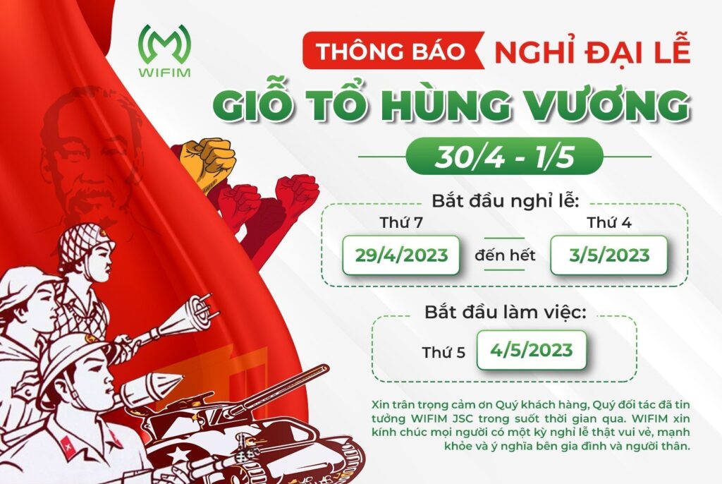 WIFIM JSC xin trân trọng thông báo lịch nghỉ lễ GIỖ TỔ HÙNG VƯƠNG, 30/4, 1/5 đến Quý khách hàng, Quý đối tác và toàn thể mọi người